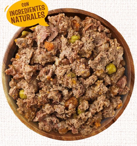 Pollo* (40%), cerdo* (20%), buey* (5%), guisantes* (2%), zanahorias* (2%), sustancias minerales, aceite de salmón*, inulina* (0,2%). *Ingredientes naturales.
